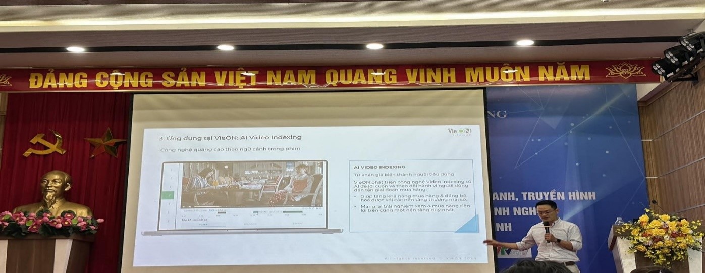 Ảnh: Đại diện Công ty VieOn trình bày giải pháp ứng dụng AI để quản lý nội dung trên dịch vụ (Abei).