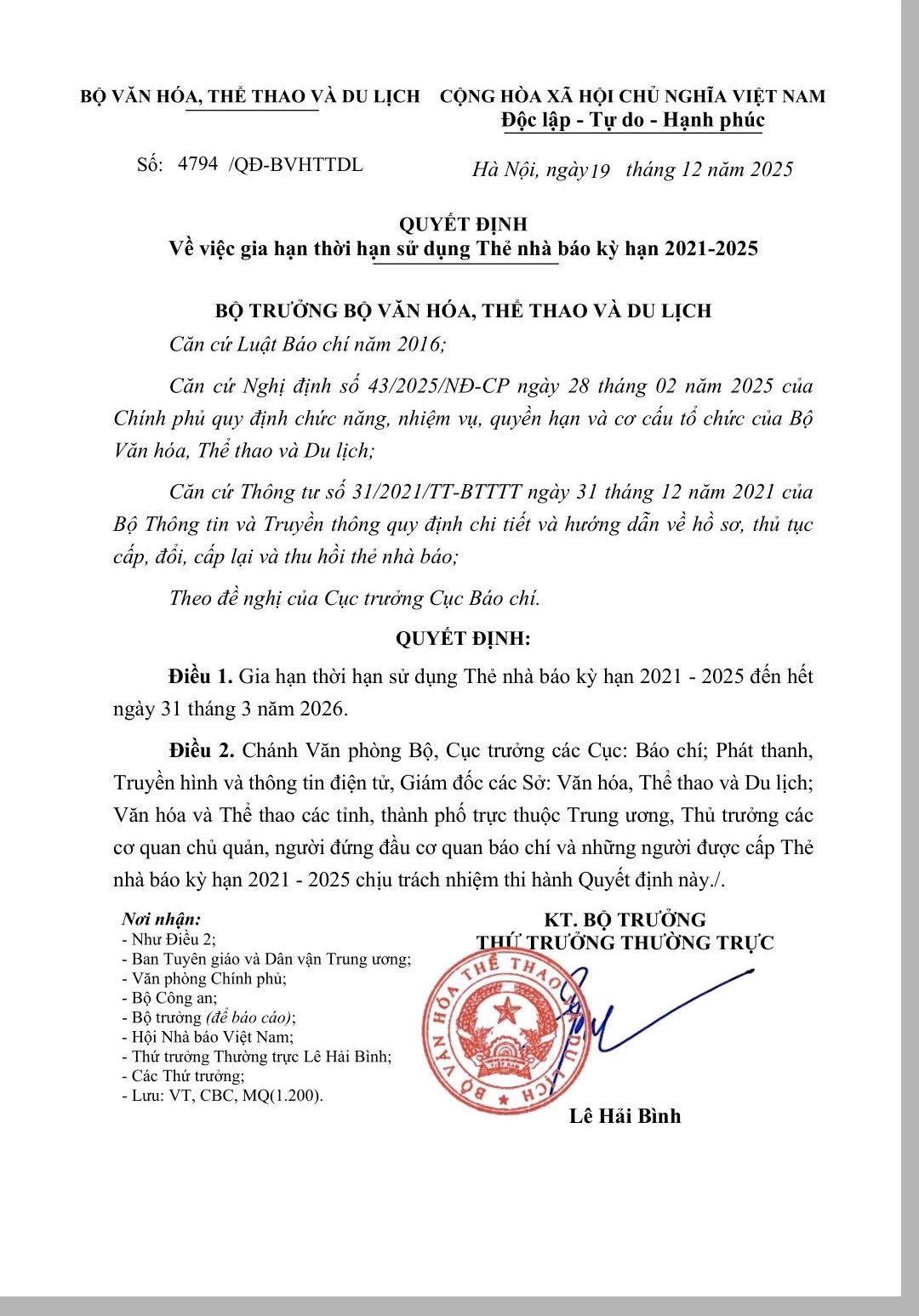 Để đảm bảo hoạt động tác nghiệp báo chí của các nhà báo không bị gián đoạn trong thời gian cấp đổi Thẻ nhà báo mới thời hạn 2026-2030, ngày 19/12/2025, Bộ Văn hóa Thể thao và Du lịch đã ban hành Quyết định số 4794/QĐ-BVHTTDL gia hạn thời hạn sử dụng Thẻ nhà báo kỳ hạn 2021-2025.